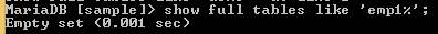 In the above example, we use the full tables statement with the like clause; here, we need to list all tables whose name starts with an emp1 word as shown in the above statement. The final output of the above query we illustrate by using the following snapshot.