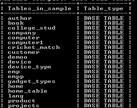 In the above example, we use the show tables command with where clause; in this example, we already connected with the database name as a sample, and with the help of the above statement, we list all base tables from the sample database. The final output of the above query we illustrate by using the following snapshot.