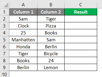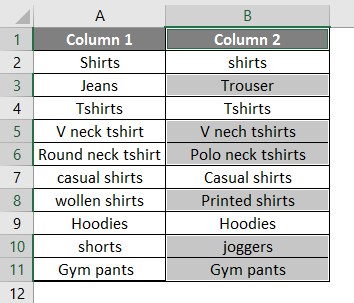Let’s compare cells in two columns that are in the same row. Below is a table with two columns with some data, which can be the same or different. We can find the similarity and the differences in data as shown below.