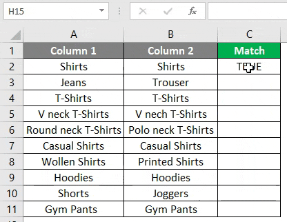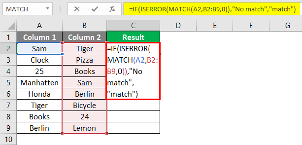 In the above example, the COUNTIF function searched A1 in column B, A2 in column B, C1 in column B, and so on until it found the value in A and returned “match”.