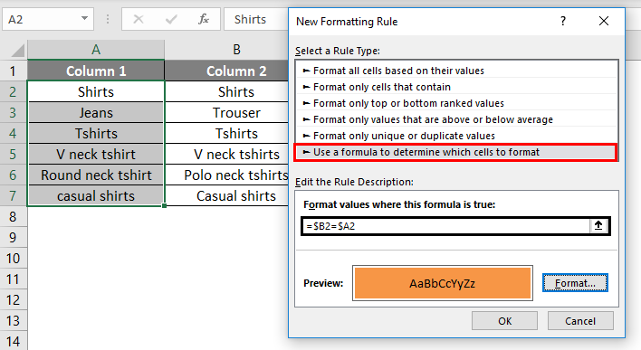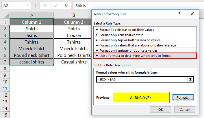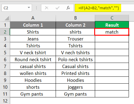 This is one of the basic comparisons of data in two columns. In this, the data is compared row by row to find the matching and difference in data.