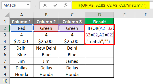 In this example, let’s compare more than 2 different columns for the match in the same row. In the below data table, we have to match all three columns in the same row and show the result in column D.