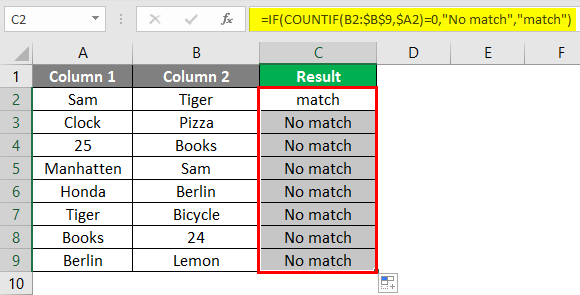 We will write the formula, press Enter, and then drag it downwards to see the result. In the below formula, we have used COUNTIF with IF. The COUNTIF formula searches A1, A2, and so on in column B, and IF gives it a condition that if there is 0, it will return “No match”; if the value returned by COUNTIF is 1, it will be a match.