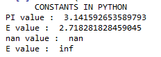 In Python, Math functions are a collection of pre-defined mathematical actions with generic implicit values that can be directly fetched for the mathematical operations in the program. There are several such math functions in python, like constants (pi for return value 3.141592, E for return value 0.718282 , nan for representing non numbers, inf for representing infinite), logarithmic functions (exp(x) returns e**x), expm1(x) returns e**x-1, log2(x) returns logarithmic value for x with base2, sqrt(x) returns square root value for x), numeric functions ( factorial(x), isinf(x), remainder(x, y) returns value of remainder for dividing x by y) and trigonometric functions (sin(x), cos(x), tanx(x)).
