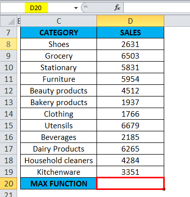 Let’s apply Max Function in cell “D20”. Select the cell “D20”, where Max Function needs to be applied.