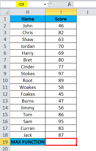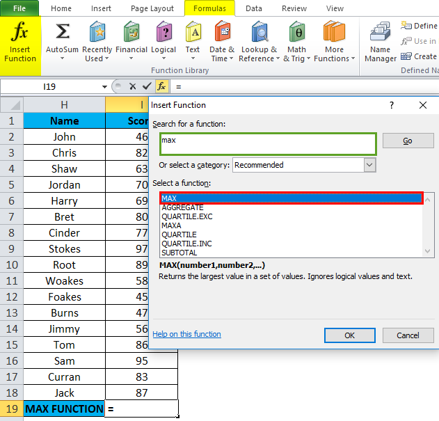 =MAX(I2: I18) Here, the score data is in the range (I2: I18). To enter the Number 1 argument, click inside cell I2 to see the cell selected, then Select the cells until I18. So that column range will get selected, i.e.I2: I18. Click ok after entering the number 1 argument.