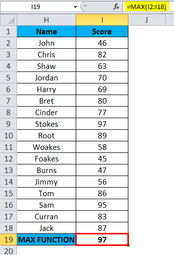 =MAX(I2: I18), i.e. returns the maximum score value of 97 as a result.