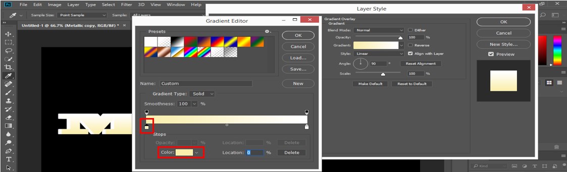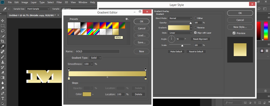 Step 16: You can see our Gradient has been saved with the name ‘Gold’ in the preset section of the gradient editor box.