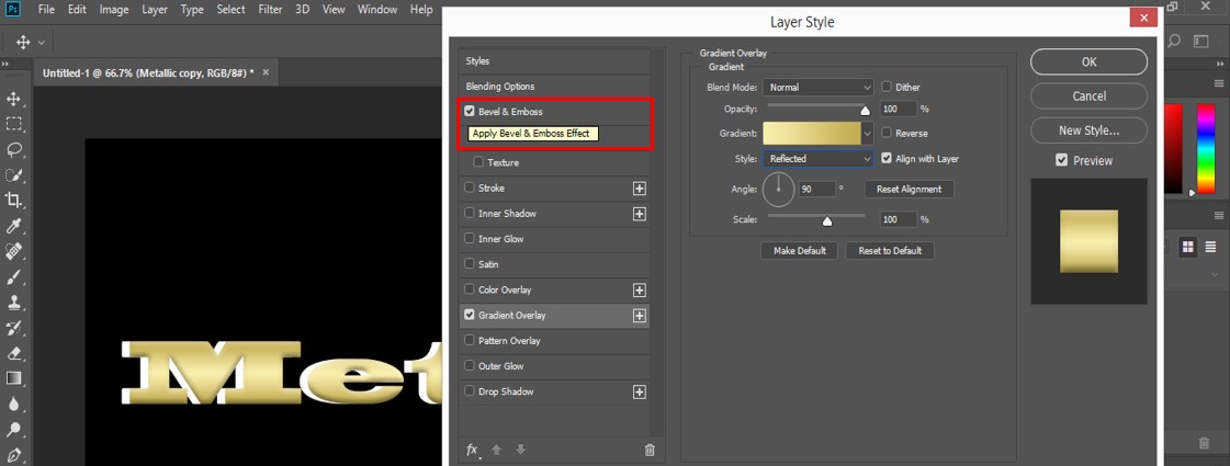 Step 18: Now select the ‘Bevel & Emboss Effect’ option for enhancing the gold effect.