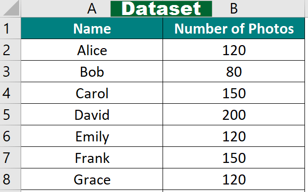 The mode preferred number of photos taken is 120 because it appears thrice in the dataset (Alice, Emily, and Grace).