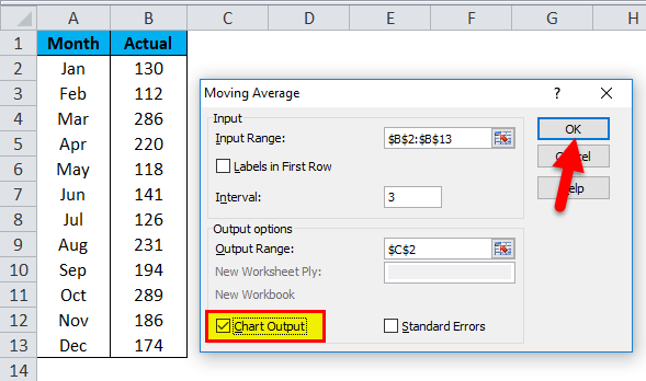 Step 7: Select the Chart Output if you need a chart to show the trend. Click OK to complete the moving average calculation.