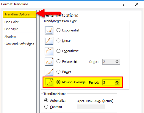 Step 4: On the right-hand side, you will see TrendLine Options. Select Moving Average and make the Period as 3.