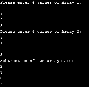 We declare an array of any number of elements and use them to perform different functions like addition, subtraction, multiplication, inverse, transform, etc. For subtraction below code can be used: