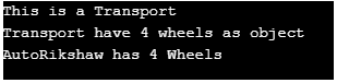 Explanation to the above code: In Example2 the base class of transport has the feature or attribute of Transport and its ability which will be passed or inherited to the intermediate class which is the four-wheeler. This four-wheeler can acquire the properties of the Transport and further the auto-rickshaw is a four-wheeler which can inherit the properties of the four-wheeler again it can be extended to any level of inheritance which again depends on the requirements.
