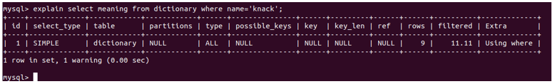 Defining an index in the table on the column name enables the scanning of only a single record with a matching keyword when retrieving its meaning. Therefore, when defining indexes in the table, we should first analyze which columns will have restrictions applied in the WHERE clause of future queries. In our case, we execute the query using the specified value on the name column to retrieve its meaning from a dictionary table.