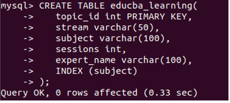 Let us have one example and create a table named educba_learning with columns topic_id, stream, subject, sessions, and expert_name. While creating the table, we will create two indexes, the primary index on the topic_id column and the secondary index on the column subject. Our query statement will be as follows –
