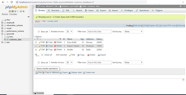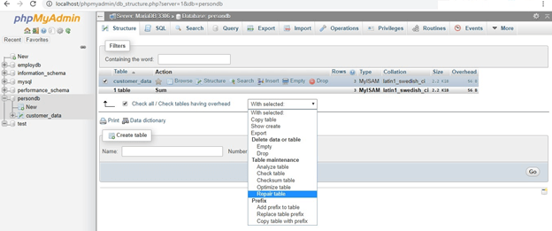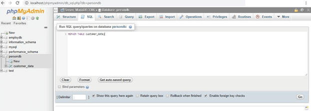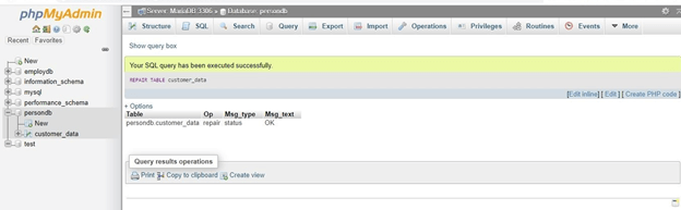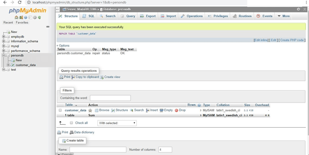 It is possible to view the status of the “PersonDb” database and the “customer_data” table and repair them if necessary. If the repair is successful, the system will display a message indicating that the status is “OK” and that the SQL query executed successfully. So, these are the procedure for Repairing a database.