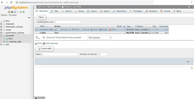 4. For example, a database ‘PersonDb’ was created as follows on the WAMP server: