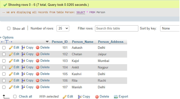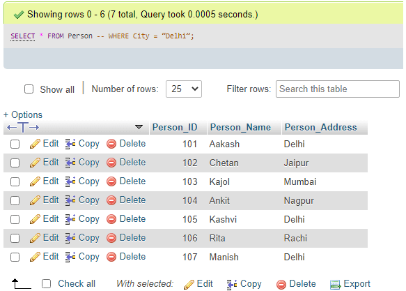 SELECT * FROM Person --WHERE City = “Delhi”;