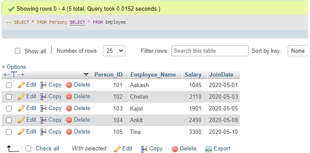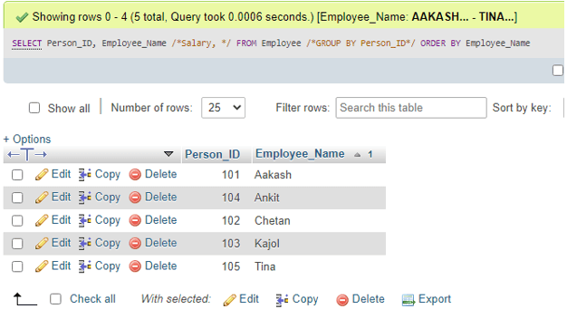SELECT Person_ID, Employee_Name/*Salary, */ FROM Employee/*GROUP BY Person_ID*/ ORDER BY Employee_Name;