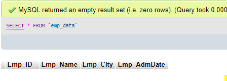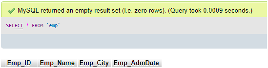 We have created the table above with column names, data types, indexes, and keys. For integers, we have used INT data type; for a date, the type of values, we have DATE type; and for character strings with length values, are used as a data type for the Emp table.