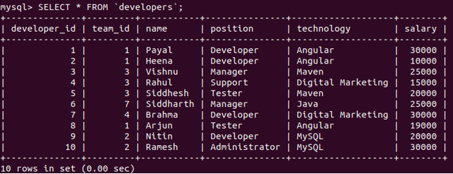 We have inserted multiple values in my table using the same insert format. Now, after retrieving the records of the developers’ table using the below SELECT query –