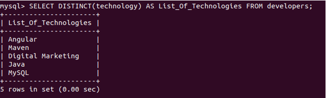 Now, let us retrieve the list of all the technologies used in the developers’ table using the distinct clause on the technology column. The query statement for this will be as follows –