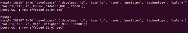 INSERT INTO `developers` (`developer_id`, `team_id`, `name`, `position`, `technology`, `salary`) VALUES('11','2','Rohan','Admin',NULL,'20000');