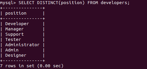 This gives the list of all the distinct positions in the developer’s table. Let us cross-check our result by comparing it with the output of the distinct query resultset of the following query.