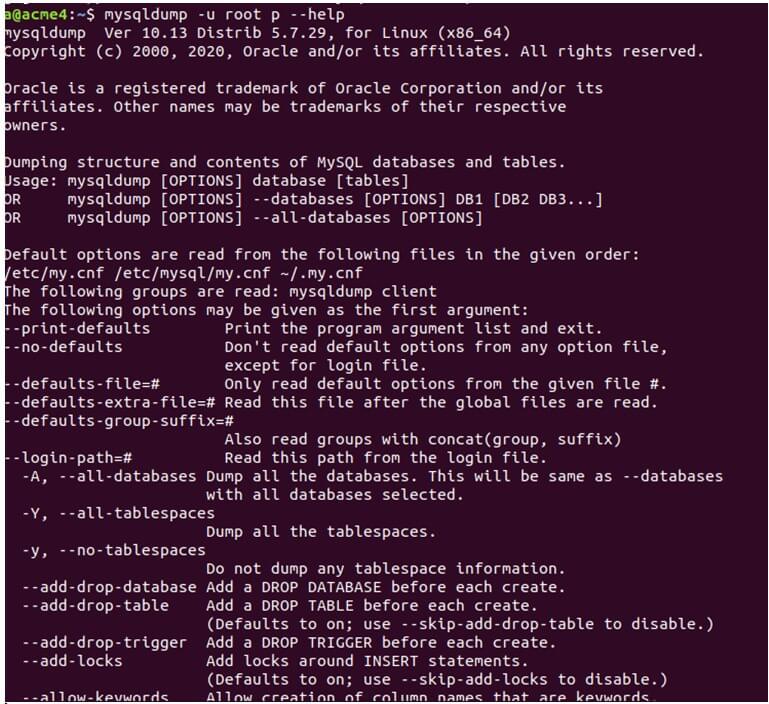 We can create the backup by dumping one or more of the selected tables or by dumping a set of one or more databases or we can dump the entire MySQL server that will contain all databases and tables in it along with other objects. You can utilize the mysqldump command to perform all three functionalities. However, the syntax for each of them varies, as outlined below:
