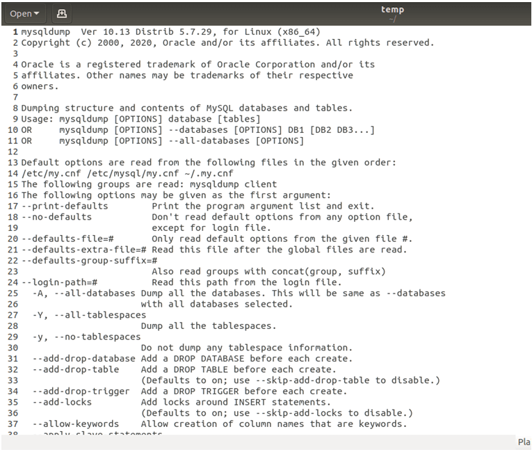 mysqldump [specified_options] name_of_database [name_of_table ...] > nameOfBackupFile.sql