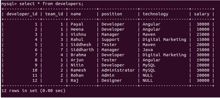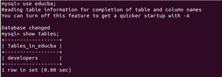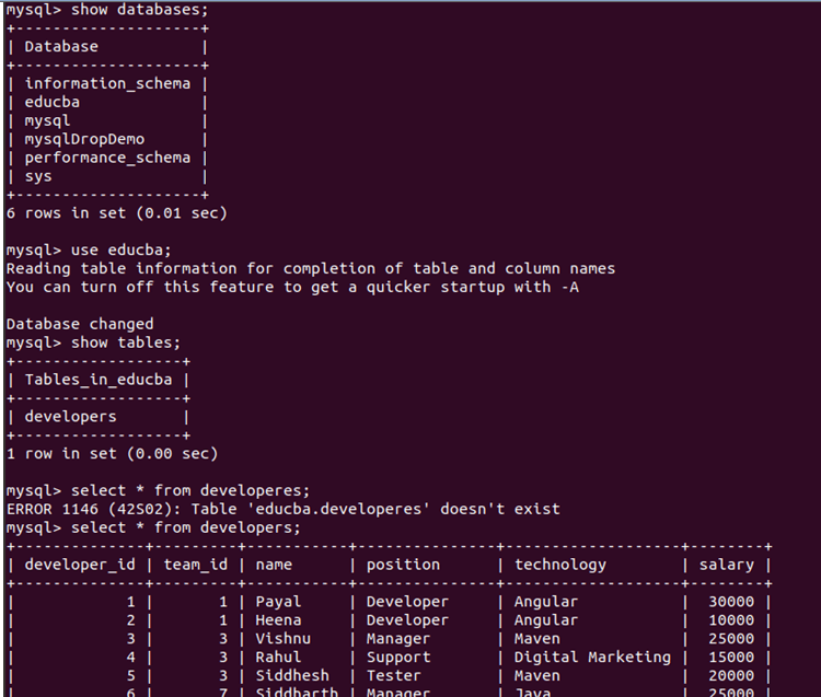 Upon restoration, it becomes evident that the database named ‘educba’ is reestablished, and it encompasses identical content as that of the ‘developer’ table, including all the records within.