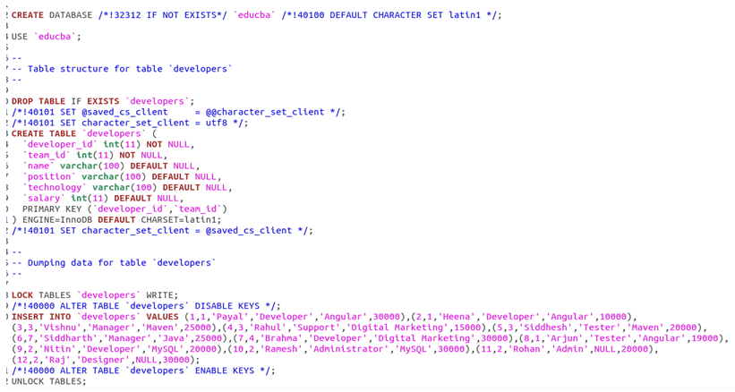 This is the dumped flat-file that was created after performing a dump of the ‘educba’ database. The file consists of commands to create the database, create a table, and insert queries to populate the table with records.