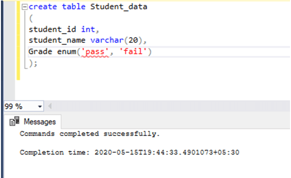 In the above insert, we could see that there are two rows the values which we inserted into the table for the column “Grade” are other than “Pass” and “Fail”. So the value will be NULL.