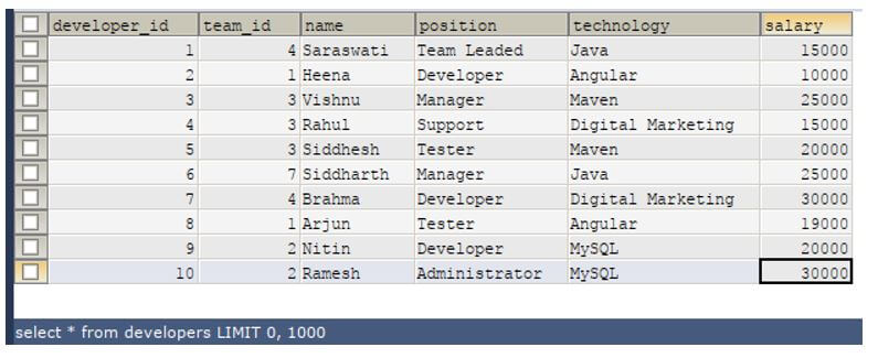 Now, after retrieving the records of the developer’s table using the below SELECT query.