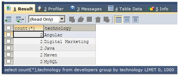 The next task is determining the number of persons assigned to each technology. We will use the aggregate function to find out the number of members, and we will group based on technology to find the person count of each technology. Our SELECT statement will be as follows.