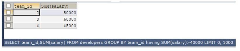 Let us now have the team ids for which we have to pay more than 40000 as the salary. For this, we will have to group the resultset based on team_id, and then by using the having clause, we will mention that the team’s total salary should exceed the 40000 limits. The SELECT query for getting the expected resultset will be as follows.