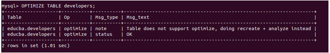 For example, we will try to optimize the InnoDB table named developers inside the educba database on my MySQL database server. For this, we will make use of the following query statement –