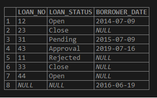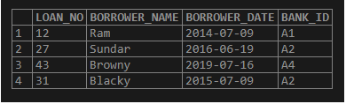 In the above table, LOAN is the right table, and the Borrower is the left table. As in FULL OUTER join, we get all rows from both tables. Here we get all the rows from the LOAN table and the Borrower table. Values not present will be NULL.