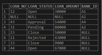 SELECT L.LOAN_NO, L.LOAN_STATUS,L.LOAN_AMOUNT, B.BANK_ID