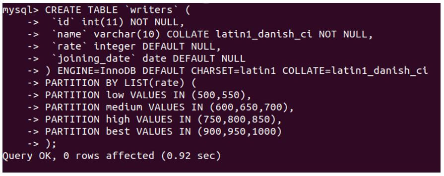 For example, we will create a table named writers containing columns name, id, rate, and joining_date and four partitions based on rates. Consider that the fixed rate values are 500, 550, 600, 650,….1000. here, we will create four partitions depending on the rate values.