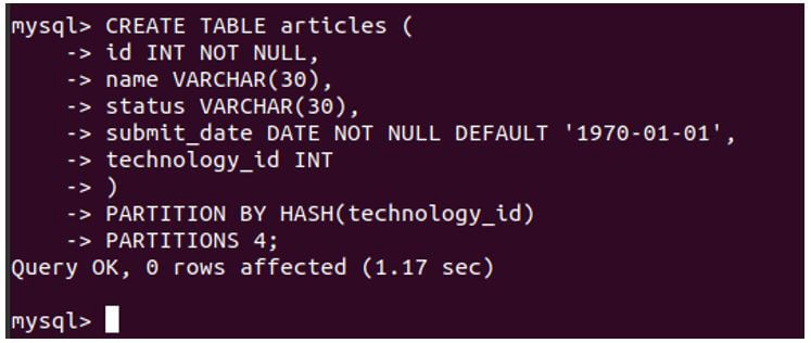 For example, we will create an articles table and four partitions on the technology_id column using the hash partitioning technique.