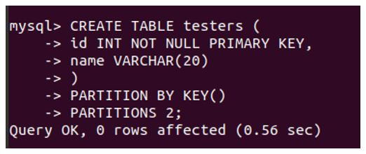 Using the key partitioning technique, we create two partitions for the table “testers” based on their key, as illustrated in the following example.