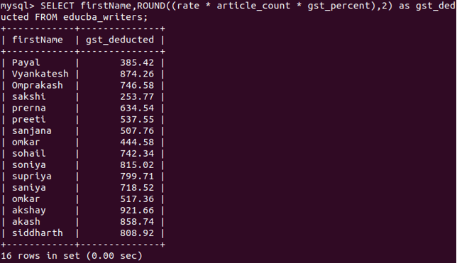 SELECT firstName,ROUND((rate * article_count * gst_percent),2) as gst_deducted FROM educba_writers;
