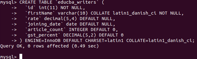 Let us create one table named educba_writers that will contain the following columns mentioned in the create table query –