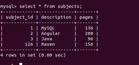 The system has inserted the value 126 in the subject_id column. If you add a record without specifying a subject_id value, the system will automatically use 127 as the next value in the sequence since the column already has 126 as its highest value. Executing the following command –