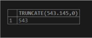 The returned value represents a numeric expression that has undergone truncation to 0 decimal places. MySQL supports this MySQL TRUNCATE() function responsible for trimming a number to a particular number of decimal positions.