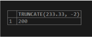 From the above statement, we can see that the TRUNCATE() function causes the negative number digits left of the decimal point of the literal number 233.33 and makes to become zero. So, as the (-2) part is 0, the resultant value has no fractional section.