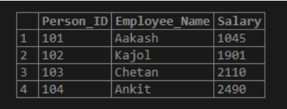 CREATE TABLE Employee (Person_ID INT NOT NULL PRIMARY KEY, Employee_Name varchar(255)NOT NULL, Salary INT NOT NULL);
