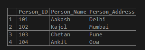 CREATE TABLE Person(Person_ID INT NOT NULL PRIMARY KEY, Person_Name varchar(255)NOT NULL, Person_Address varchar(255)NOT NULL);